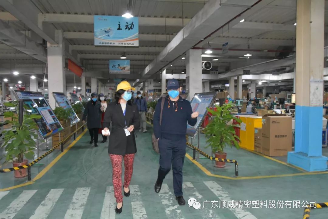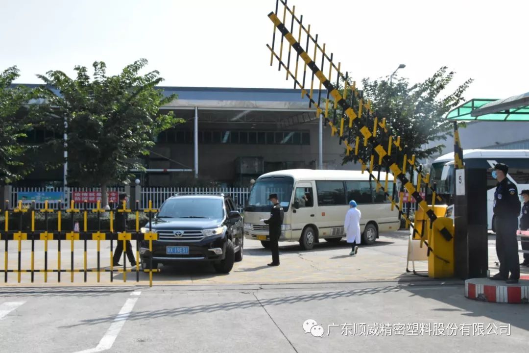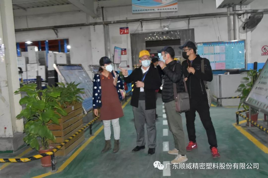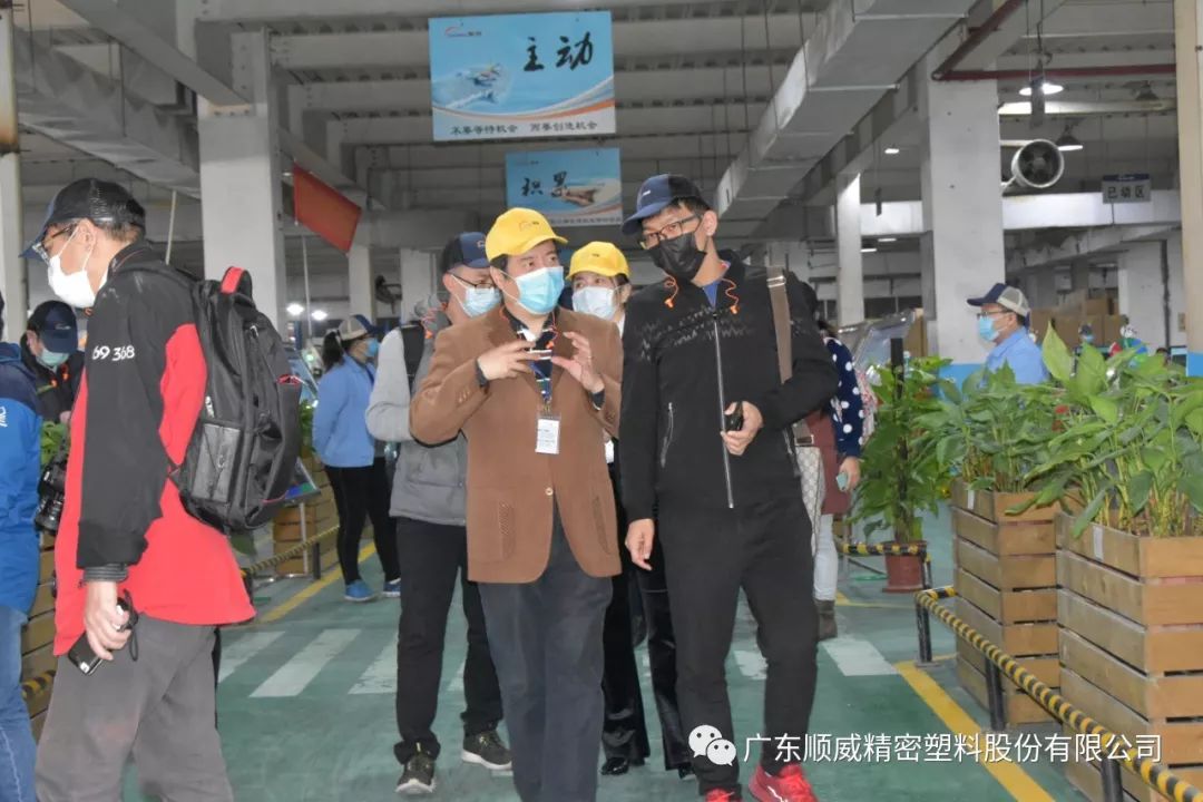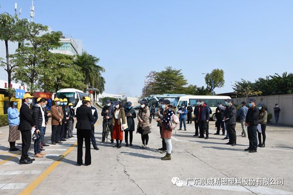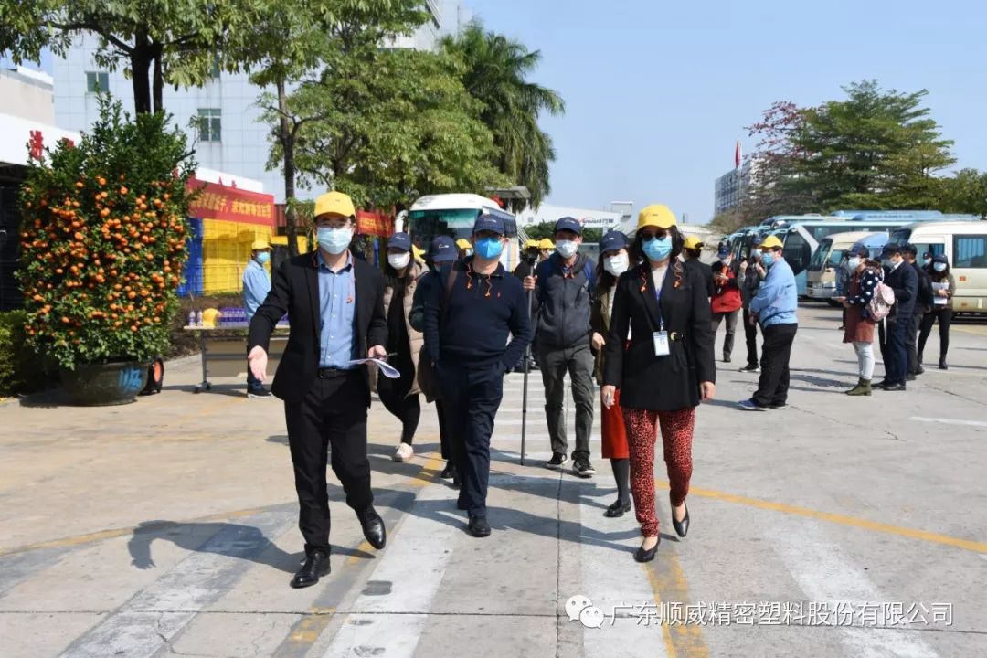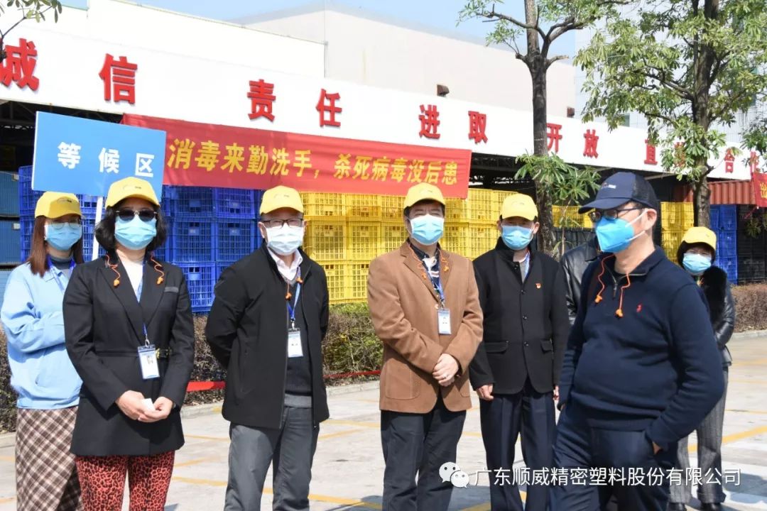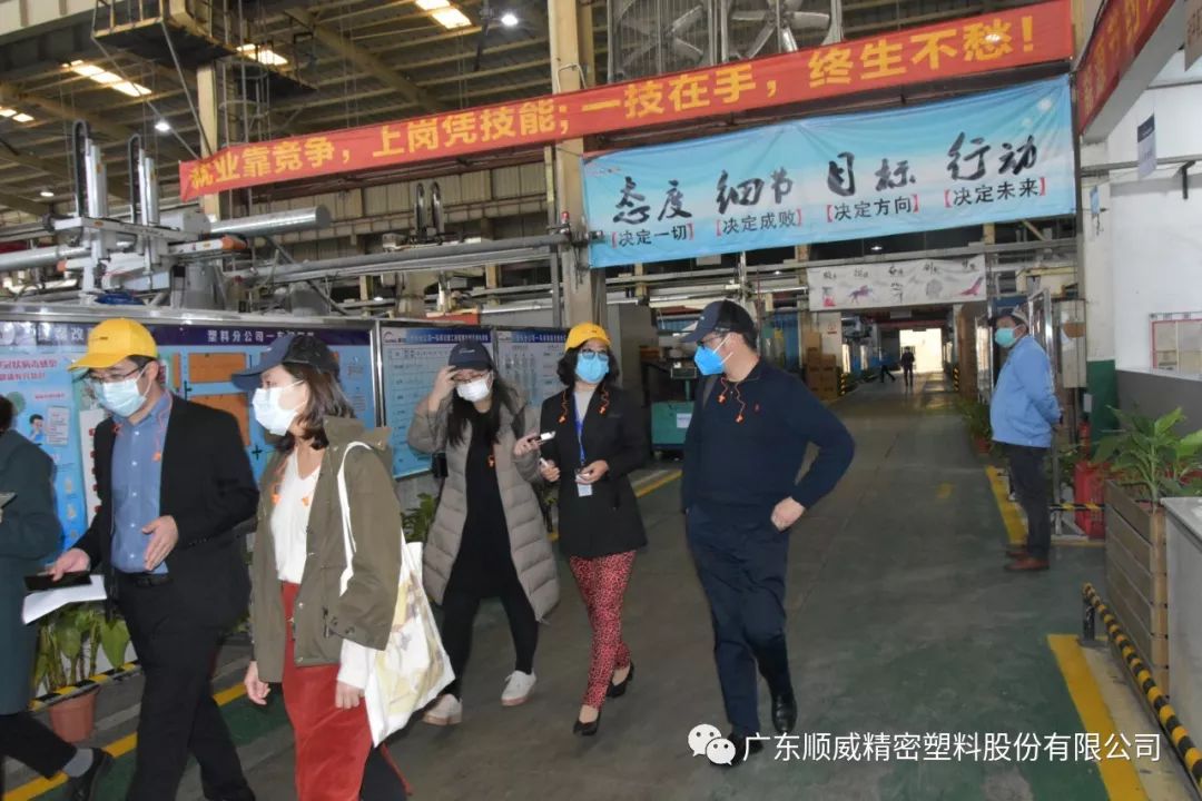 韦德1946股份董事/总裁莫绮颜、董事/副总裁成再育、董事/副总裁/董事会秘书李笛鸣、工会主席/审计部总监童贵云、顺德塑料分公司总经理范瑞强、顺德模具分公司总经理庞利彬、集团战略及商务中心/集团人力行政中心总监罗华、国内营销中心总监助理/大客户部高级经理王晓菲,一众公司高管团队在厂区广场迎接中外媒体参观团一行的到来。